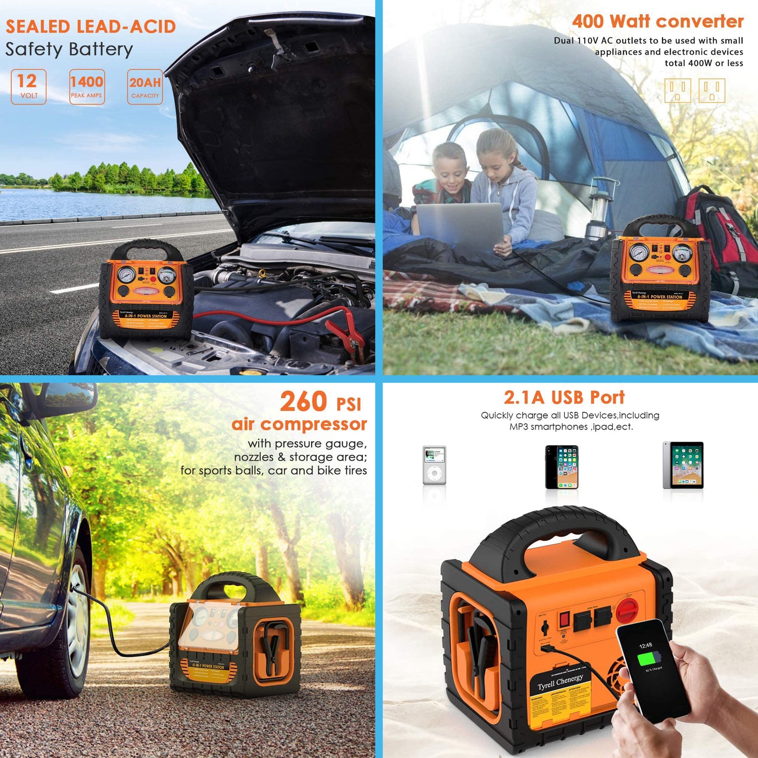 Equipped with 20AH (20000mAh) sealed lead acid battery,delivers 1400 peak amps,suitable to jump-start a 12 volt battery in your car, truck, SUV, motorcycle, boat, RV, ATV, or tractor Important:For optimal...